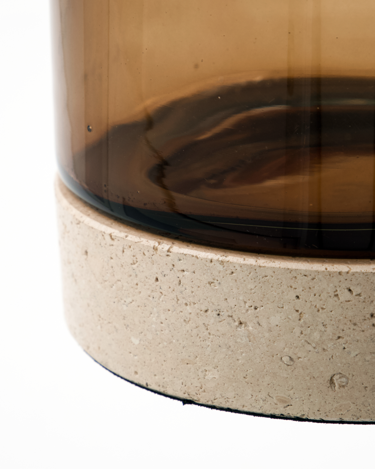 Elevate your home decor with this sophisticated candle holder, combining mouthblown glass and travertine in a warm brown shade. Ideal for tealights, pillar candles, or LED, it looks stunning alone or alongside others from the same collection.