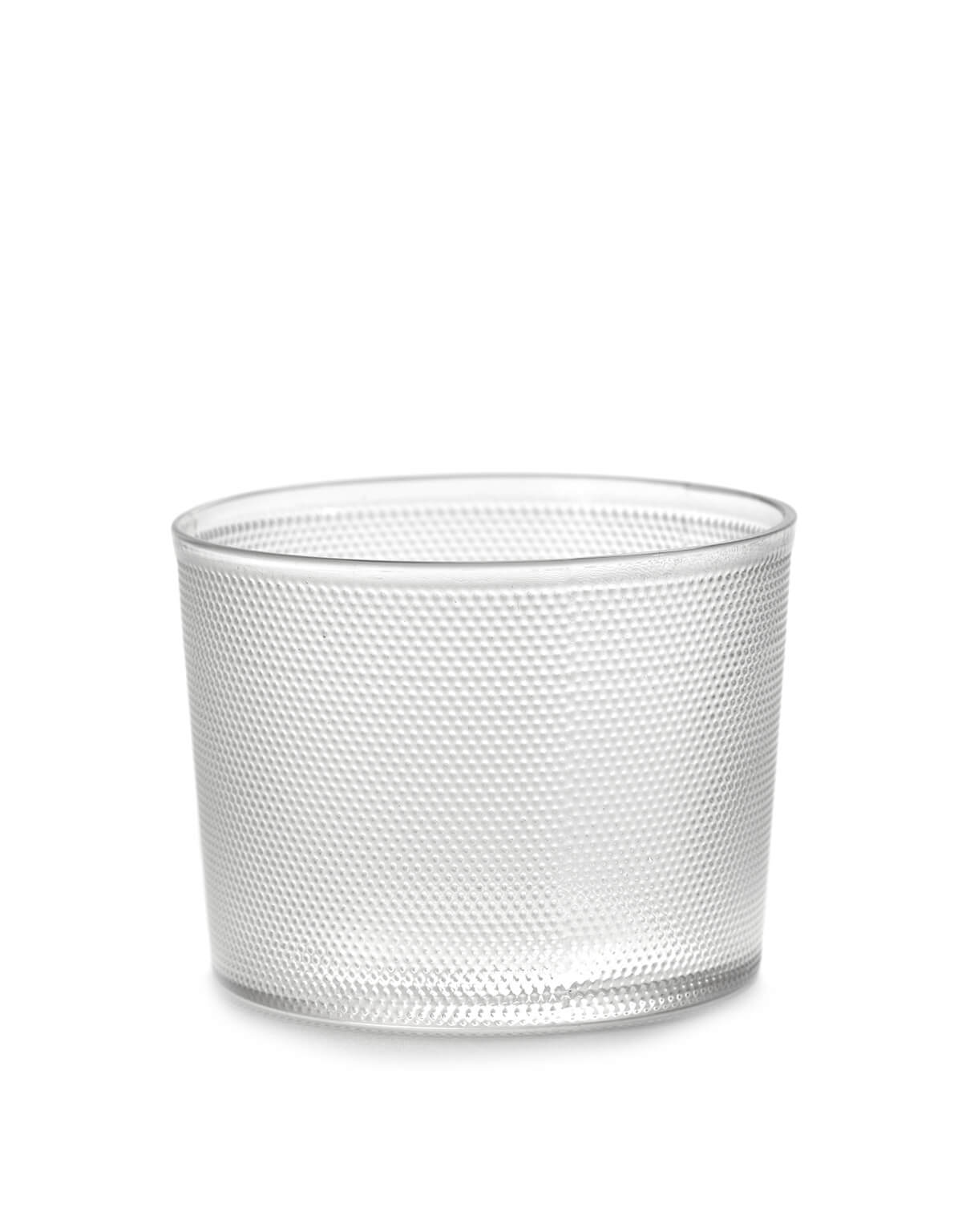 Beauty in their basic form and mould-blown texture sit in perfect harmony with other items from the Merci Collection. 5.8cm tall, 8.2cm diameter, and able to hold 200ml. Packaged in a gift box.