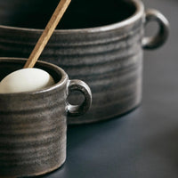 MINDY bowl in matte black. MINDY features a simple design that fits most occasions. Whether you're preparing the table for morning or evening, MINDY will be an elegant addition to your table setting. The bowl has a modern and clean look with a matte glaze, giving it a sleek appearance. The bowl has two practical handles and is ideal for food storage or serving.