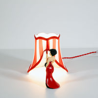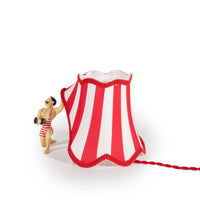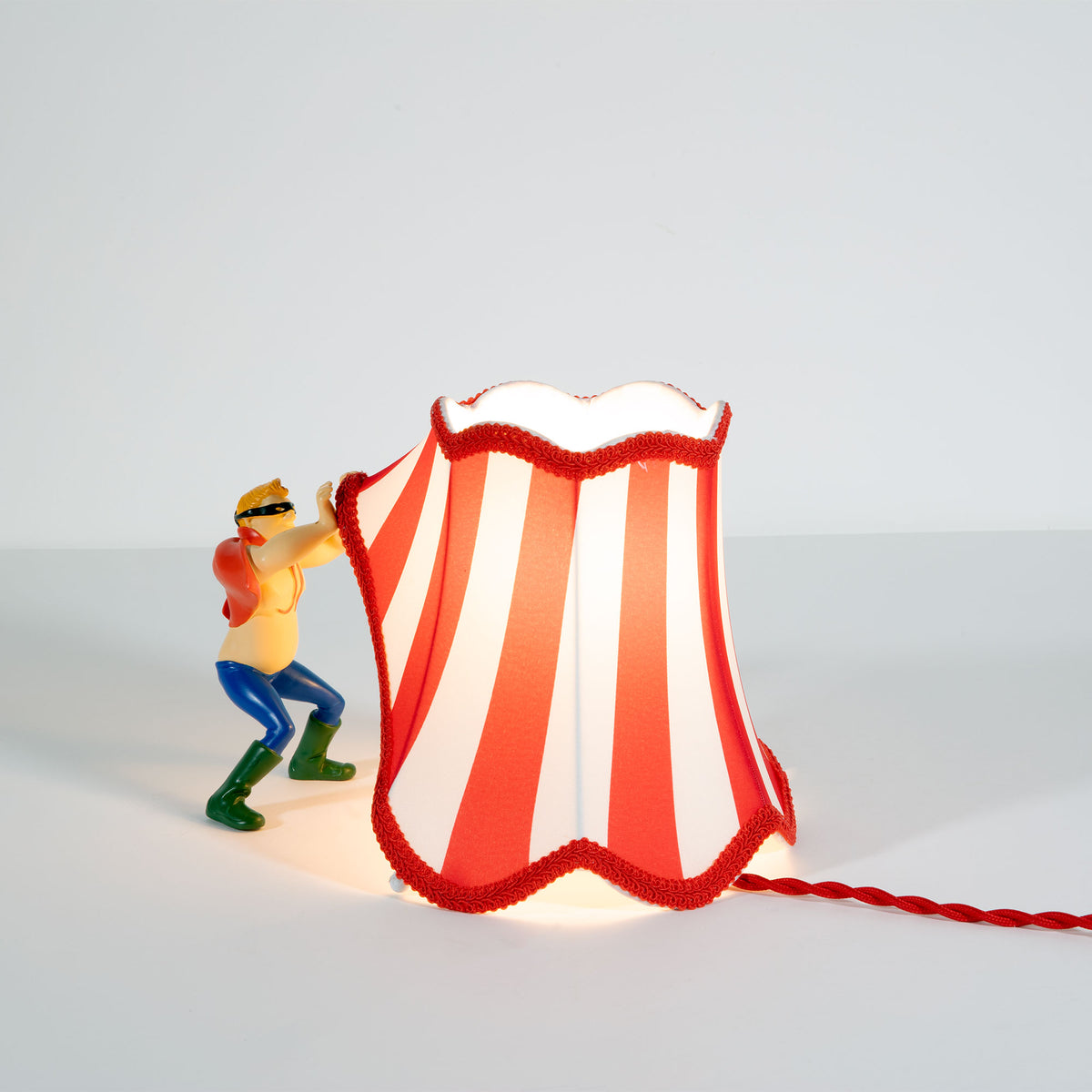 Funny characters inspired by the circus world find themselves struggling with a lampshade that absentmindedly they mistake it for their circus tent.Eager to show off their skills or strength, they lift a flap of the lamp/curtain ready to enter the scene.Table LampSize: cm 26 x h.19 | 10,2'' x h. 7,4''220-230 V ~ 50/60 HzLED Bulb Max 1x4W E14 BULB NOT INCLUDED