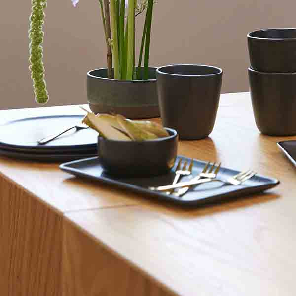 Set a sophisticated, unique, raw, deep black-in-black table, or mix it up.