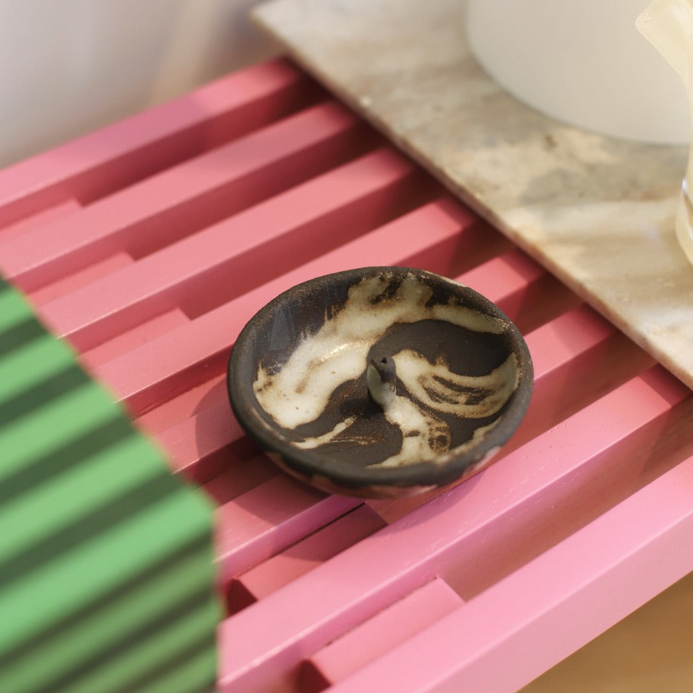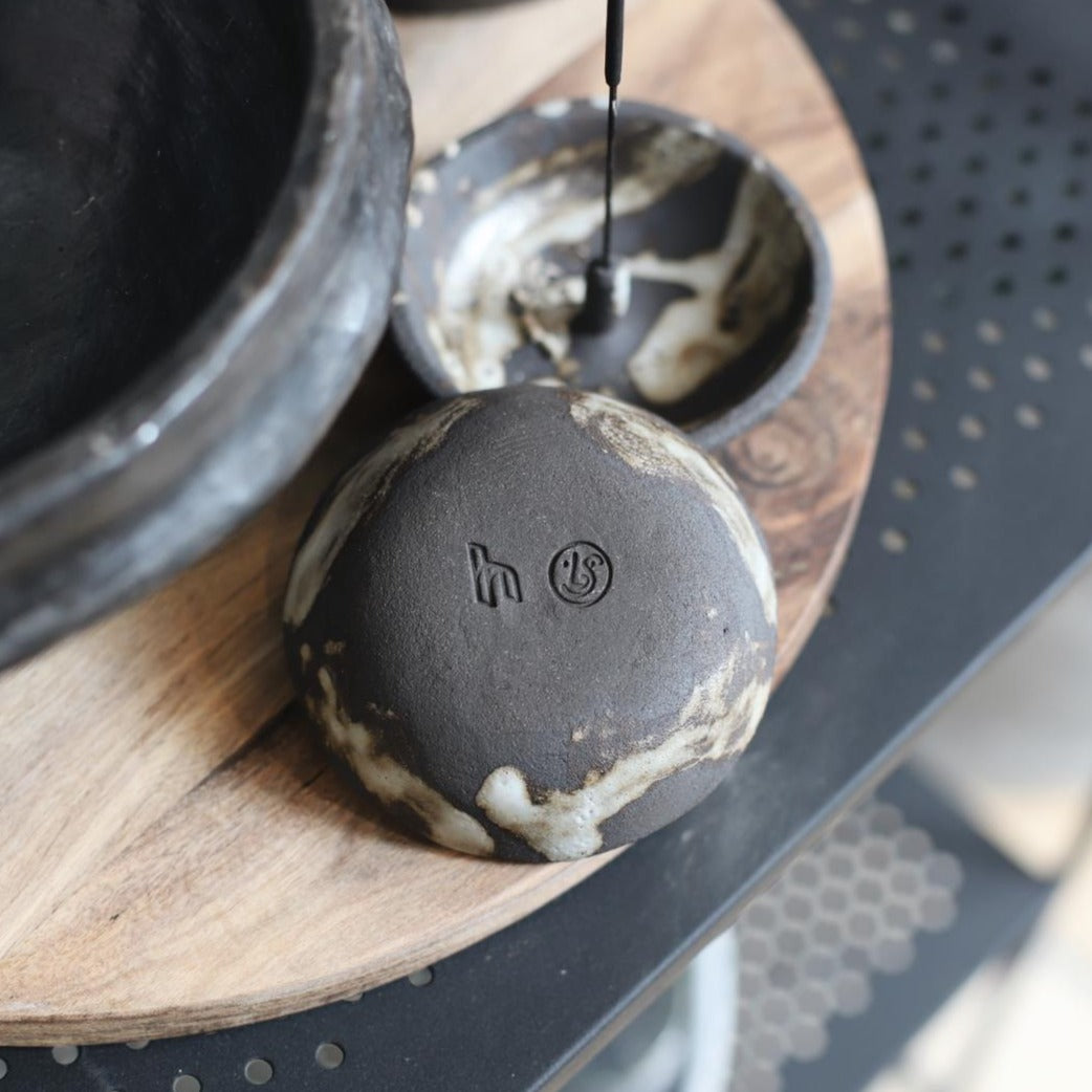 They are all unique in that the pattern created by the glaze is reminiscent of the smoke from an incense stick. With a hole created to hold your favourite incense as straight up as possible.