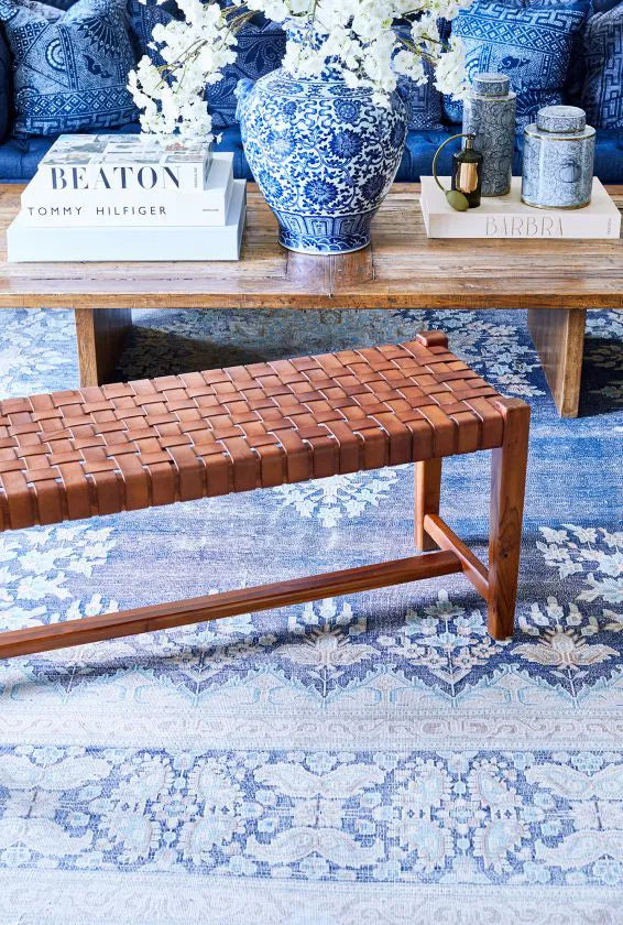 Leather and Teak Porto Bench, Cognac, Handmade 118cm