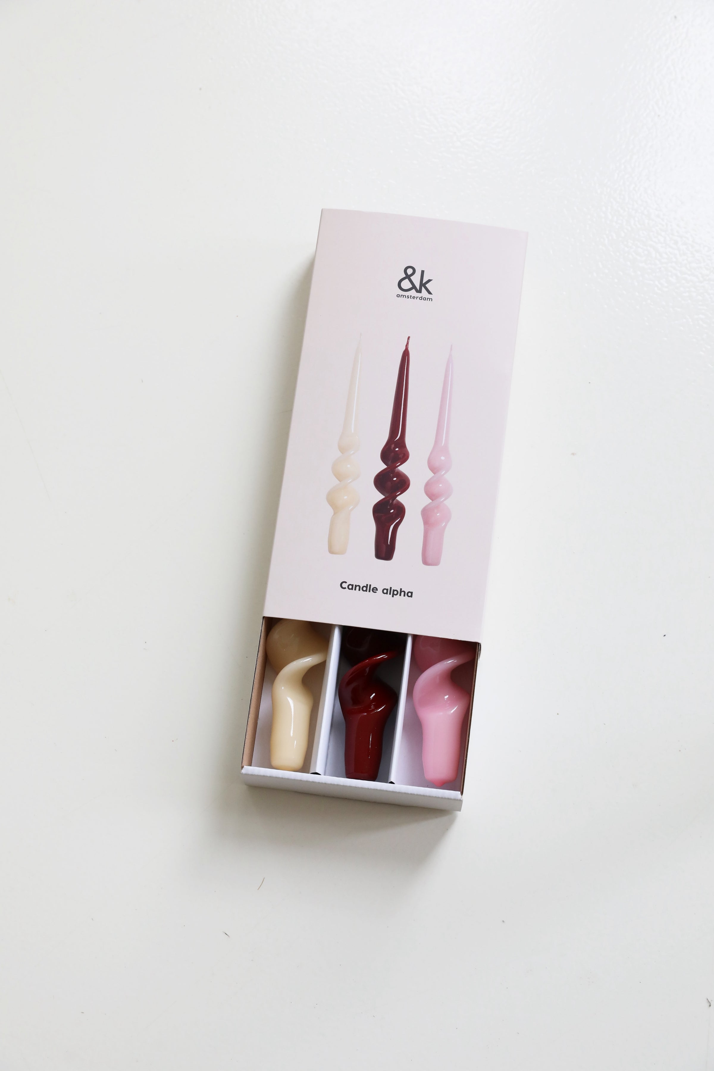 - Set: 3 spiral taper candles (reds colourway: pink, cream, deep red)