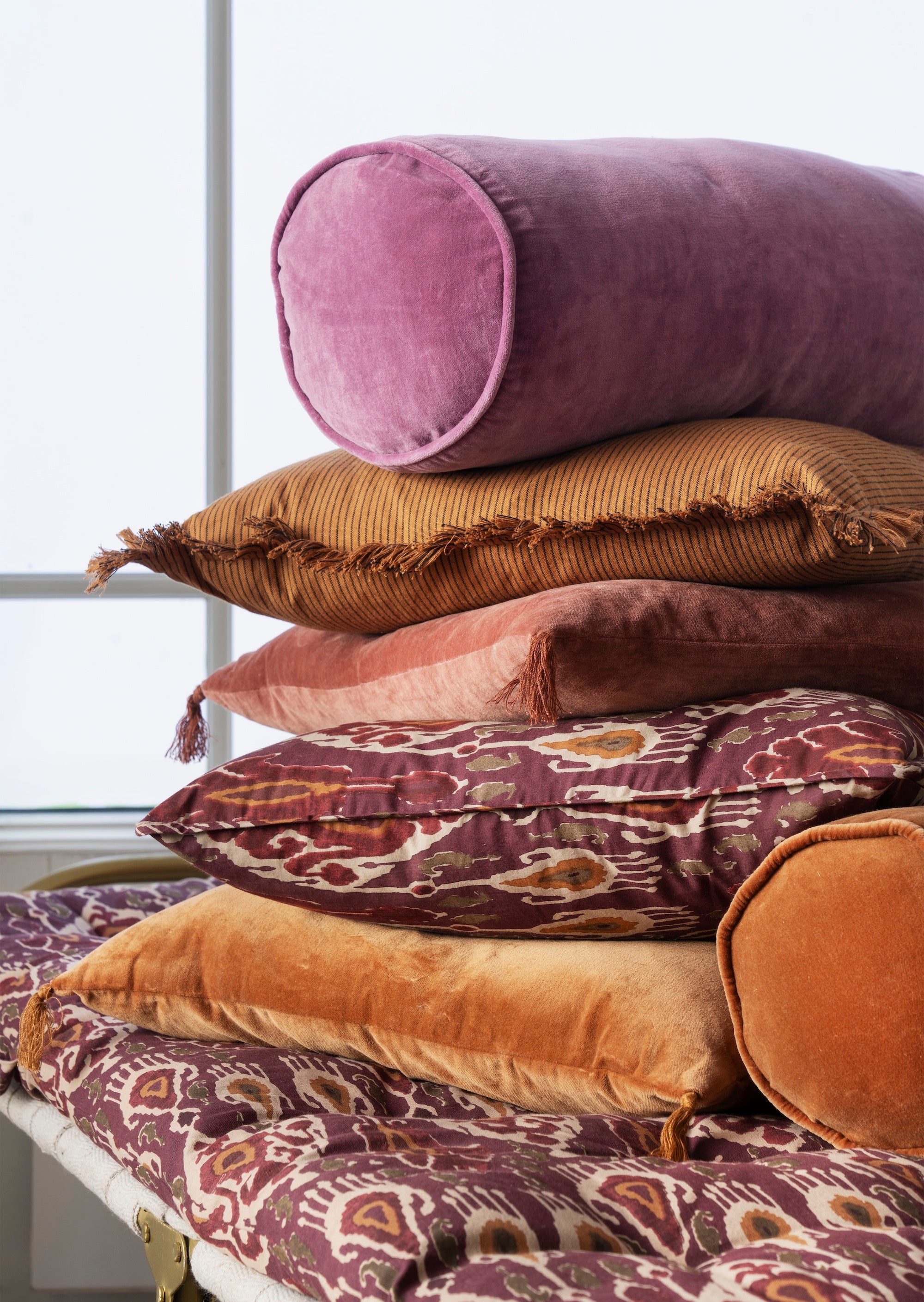 The colour is stunning — a deep burnt orange that feels both grounding and joyful. It layers beautifully with mustard, burgundy, olive, neutrals, and all those autumnal textiles we love. The velvet gives it a luxurious softness, while the bolster shape adds personality to any cushion arrangement.