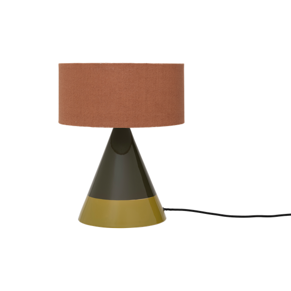 Hand-painted in deep olive and warm mustard, the colour-block finish adds a playful, design-forward edge — the kind of detail that effortlessly elevates a bedside table, reading nook, or hallway console. When lit, the shade diffuses a beautifully gentle glow, making evenings feel calmer and corners feel cosier.