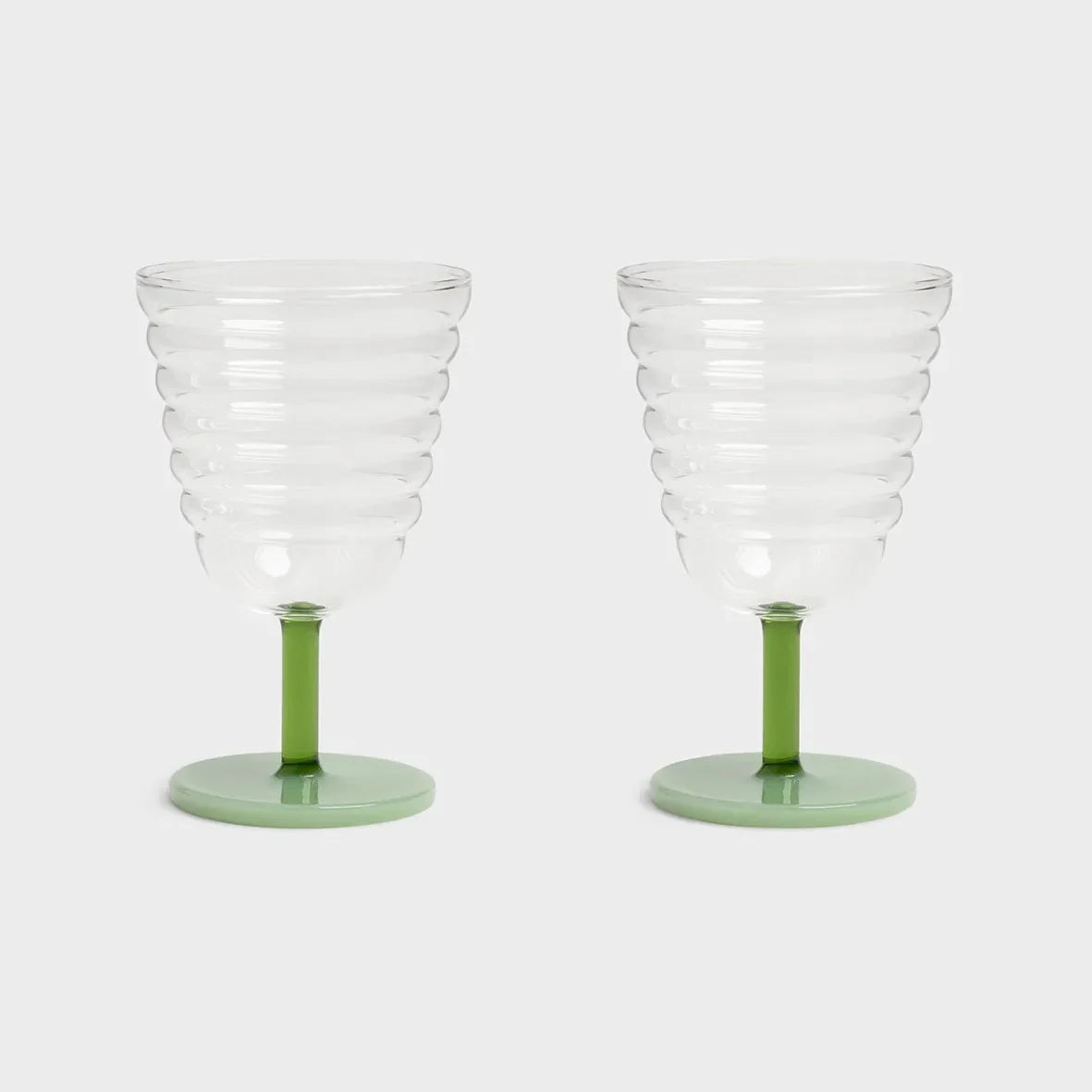 The Goblet Mingle Green Glass Set of 2 by &Klevering is made for easy entertaining and everyday moments that still feel a little special. With their playful goblet shape, clear ribbed glass, and fresh green stem, these glasses bring a relaxed, festive feel to the table without trying too hard.