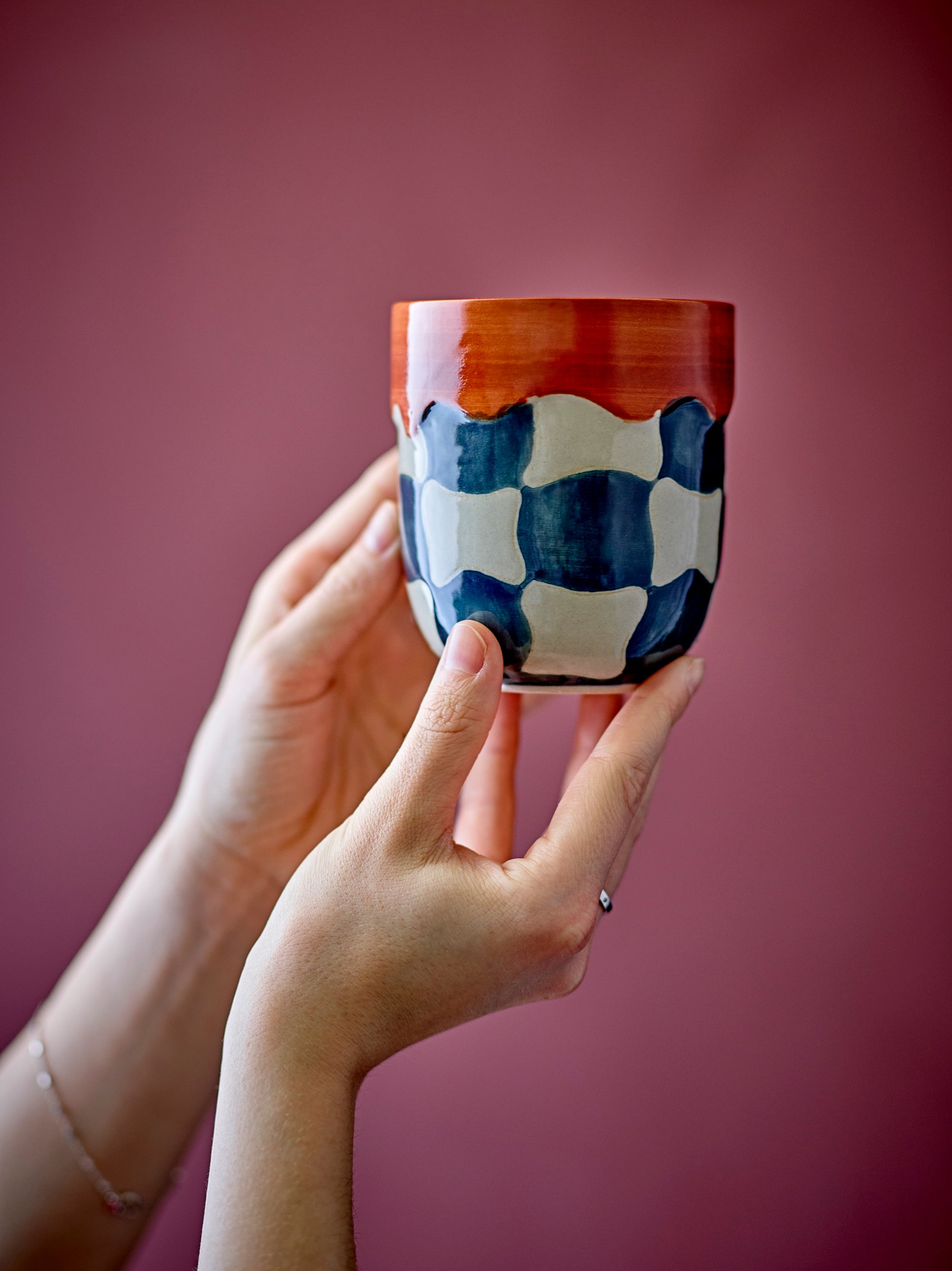 Fed up with plain mugs? The Check Cup’s hand-painted checkered pattern, rich blue and cream tones, and warm red rim bring instant character and modern style to every sip—plus, it’s dishwasher and microwave safe for easy everyday living.