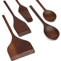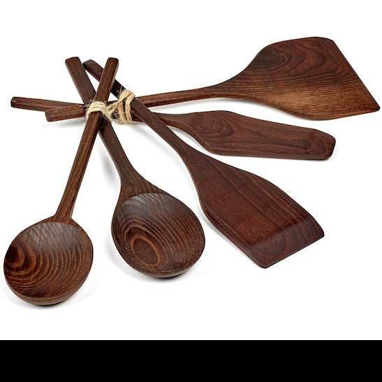 This handy set of kitchenware includes three spatulas and two spoons. They're made of wood so you can use them with anti-stick pans. Thanks to its innovative design, this set extends usability from the kitchen to the table for serving dishes.